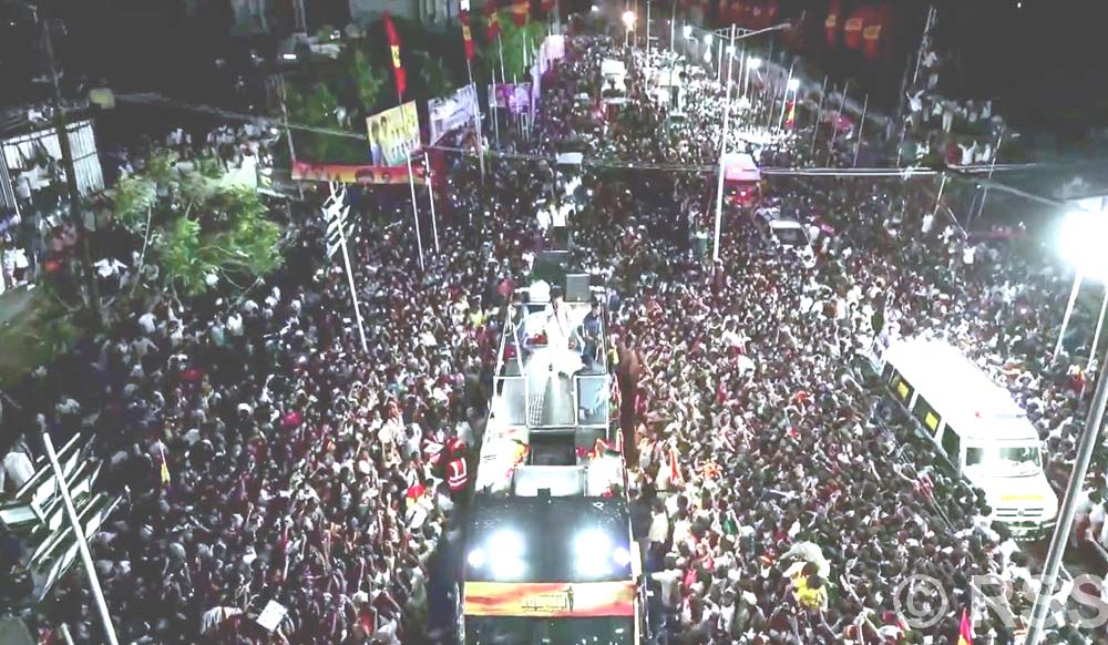 प्रेस ट्रस्ट अफ इन्डियाका अनुसार विजयले आफ्नो अभियान गाडीबाट र्यालीलाई सम्बोधन गर्दा कम्तीमा ३० जना बेहोस भएका थिए । उनीहरूलाई तत्काल एम्बुलेन्समार्फत अस्पताल लगिएको थियो। अवस्था गम्भीर हुँदै गएपछि विजयले भाषण बीचमै रोक्नुभएको थियो तर केही समयपछि फेरि निरन्तरता दिनुभएको थियो । अन्ततः विशाल भीडमा असामान्यता देखिएपछि भाषण पूर्ण रूपमा रोकिएको थियो।