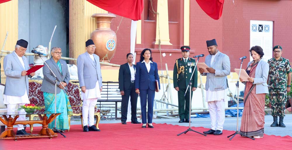 राष्ट्रपति रामचन्द्र पौडेलले राष्ट्रपति कार्यालय, शीतलनिवासमा आयोजित विशेष समारोहमा नवनियुक्त स्वास्थ्य तथा जनसङ्ख्यामन्त्री डा सुधा गौतम र युवा तथा खेलकुदमन्त्री बब्लु गुप्तालाई शपथ दिलाउनुभएको हो । यसअघि चार मन्त्रीले शपथ लिने भनिए पनि अन्तिम समयमा दुई जना मन्त्रीले मात्रै आज शपथ लिनुभएको छ ।
