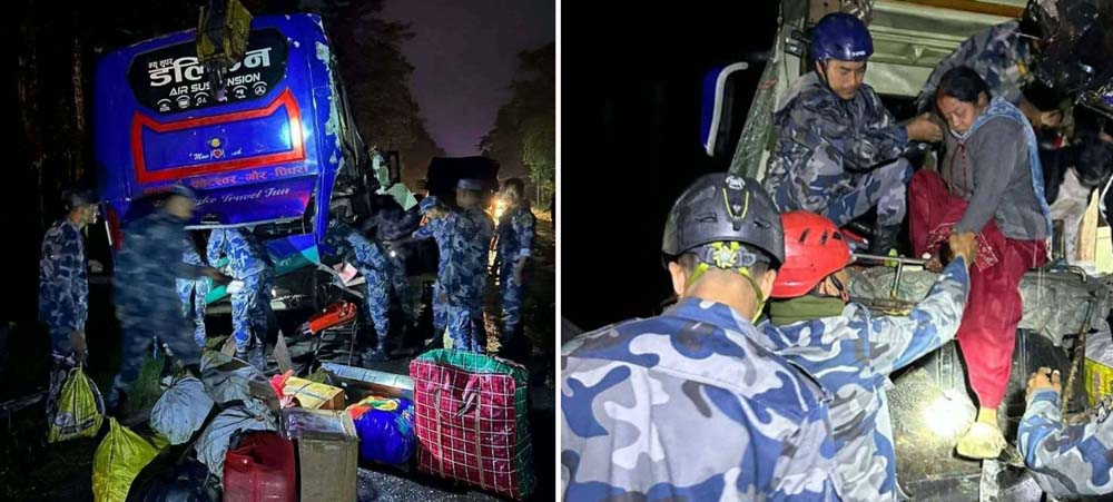 रौतहट, १४ कात्तिक । बससहित तीन सवारी साधन ठोक्किदा ३३ जना घाइते भएका छन। चितवन जिल्लाको भरतपुर महानगरपालिका–९ टिकौली जंगलमा एउटा ट्रक र दुर्ईवटा बस आपसमा ठोक्किएको हो । भरतपुर महानगरपालिका–९ टिकौली जंगलमा ईट्टा लोड गरेर पार्कीङ्ग गरिराखेको ना ६ ख ८१३ नम्बरको ट्रकमा गौर बाट काठमाडौं आउदै गरेको बा. प्र.०३०० ख ०१२३ नम्बरको डल्फिन यात्रीबाहक बस ठोक्किएको र सोही बसमा जनकपुरबाट काठमाडौं आउदै गरेको बा .प्र.०३०० ख ३९०२ नंम्बरको रूद्राक्ष यात्रीबाहक बस शुक्रवार बिहान करिब पौने २ बजे ठोक्किएको प्रहरीले जानकारी दिएको छ । बस सडकमा पल्टिएको र दुर्घटना लगत्तै सशस्त्र प्रहरी बल, नेपाल नं. १७ गण आपटारी चितवनबाट गएको सुरक्षाफौजले घाइतेहरूको तत्काल उद्धार गरेको प्रहरी हो । घाइतेहरूको चितवन मेडिकल कलेजमा १५ जना, नेशनल सिटी अस्पतालमा १३ जना र भरतपुर अस्पतालमा ५ जनाको भर्ना गराइ उपचार भइरहेको जिल्ला प्रहरी कार्यलय चितवनले जनाएको छ । सडकबाट बसलाई हटाएर सडक एकतर्फी खुलाइएको छ । प्रहरीका अनुसार एक जना बसका चालकलाई नियन्त्रणमा लिएको र यस विषयमा थप अनुसन्धान भईरहेको छ । दुर्घटनामा दुर्ई बसका चालकसहित ३३ जना घाइते भरतपुरको नयाँ मेडिकल कलेजमा उपचार भईरहेको र सबैको अवस्था मध्यम रहेको प्रहरीले जनाएको छ ।